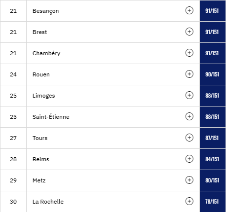图卢兹又一次占据了榜首地位,且得分也有所上升;雷恩排名也保持在第二的位次;斯特拉斯堡和蒙彼利埃排名并列第三的位置;里昂排名略有下降,和格勒诺布尔并列第五;波尔多和南特分列第七和第八位;巴黎稳定在第九位;普瓦捷跻身前十,也把马赛挤到了第13的位置。