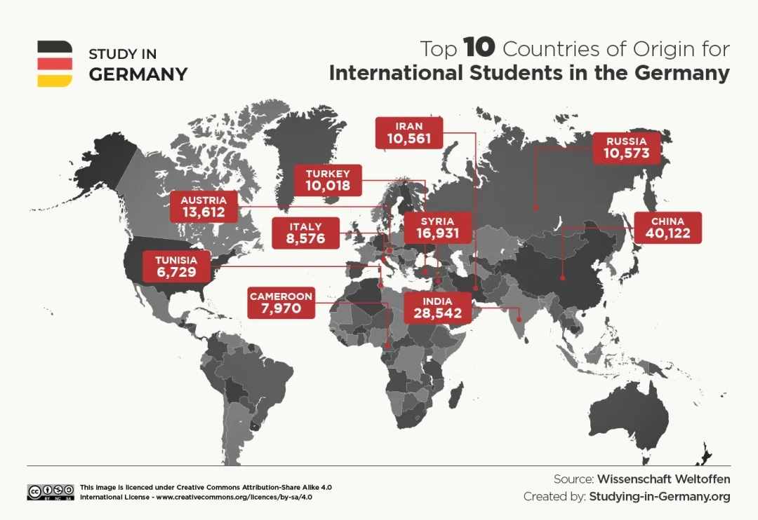 在德国大学的国际学生主要来自以下几个国家:印度、中国、叙利亚、奥地利和土耳其。直到最近,中国一直是德国大学国际学生的主要来源国,七年间增长了214.5%。目前在德国的中国学生人数为40,122人。