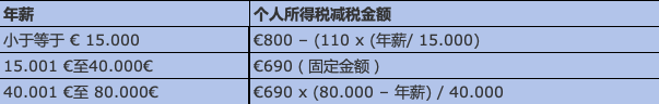 根据上表,如果一个雇员年薪为32000欧,他在这项减税补贴下能获得的年度个税减税金额为:480+[120 x (35.000–32000)/7.000] = 531,43 欧